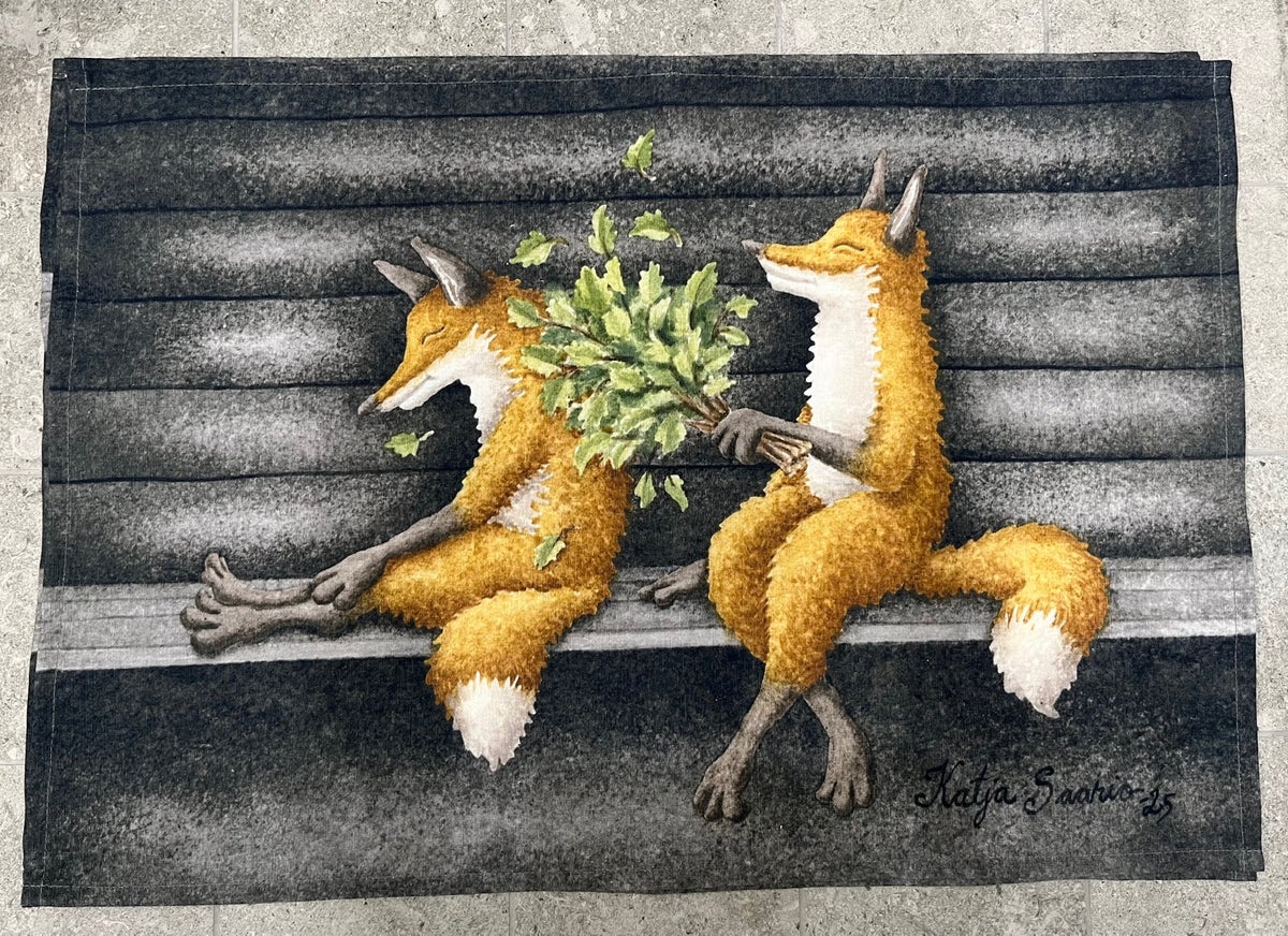 Taitelija Katja Saarion suunnittelema laudeliina (suunniteltu yhdelle ihmiselle) /keittiöpyyhe, 43,5 x 65 cm.